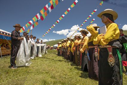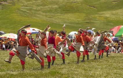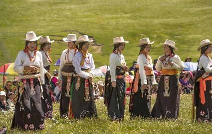 據(jù)說早在吐蕃時期,人們以村寨為單位,在本教僧人的帶領下高舉幡桿,手拿青棵、麥穗,繞田間地頭轉圈,祈禱神靈保佑,獲得豐收。儀式結束后,就在草場上展開角斗、斗劍、耍梭標等活動。格魯派興起后,這一活動仍得到保留,只是在繞地巡游時,人們要舉佛像、背經(jīng)文,文體活動也增加了賽馬、射箭、馬術、藏戲、民間歌舞等內(nèi)容。解放后,革去了繞地巡游等一些宗教儀軌,增加了許多休閑娛樂、物資交流的內(nèi)容?!巴?jié)”沒有固定日期,各地根據(jù)農(nóng)事而定,一般在秋收前(8月)擇吉日舉行,時間1-3天。