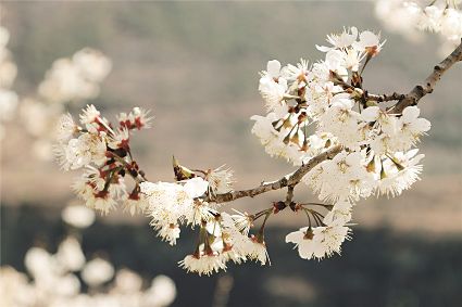說(shuō)起三月瀘定的美,可不止油菜花。在冷磧鎮(zhèn),純白如雪的櫻花也競(jìng)相開放。它們花團(tuán)錦簇,映著藍(lán)天,頗為壯觀。櫻桃花林中,簇簇花兒綴滿枝頭,潔白若仙。微風(fēng)吹過(guò),滿樹搖曳,像極了千萬(wàn)個(gè)精靈在春色中舞蹈。
