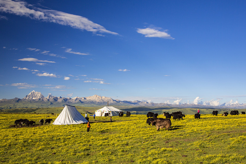然后行走在山水之間,擁抱大自然,尋找屬于自己的“詩和遠(yuǎn)方”。油綠的青稞、小麥,散發(fā)出濃郁的田園風(fēng)味;天邊群山起伏,磅礴的氣勢(shì)瞬間感覺人在自然面前實(shí)在太渺小;帳篷點(diǎn)綴著開滿野花的牧場(chǎng),牦牛哞鳴,一片生機(jī),細(xì)細(xì)體會(huì)牧民“逐水草而居”的生存智慧......