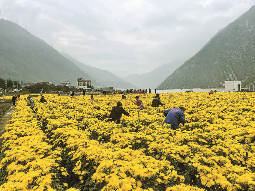藍天白云,川藏第一橋下,金絲皇菊盛開,村民在菊田里忙碌著,靈巧的雙手在菊花叢中跳躍著,一幅田園畫卷映入眼幕。