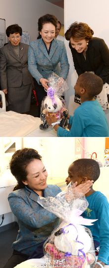 彭麗媛在巴黎尼克爾兒童醫(yī)院看望患病兒童