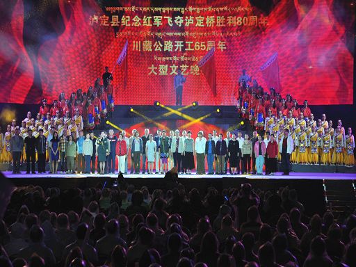 5月29日晚,一臺由中共瀘定縣委、瀘定縣人民政府主辦,四川師范大學承辦的瀘定縣紀念紅軍飛奪瀘定橋勝利80周年暨川藏公路開工65周年大型文藝晚會《永遠的豐碑》在瀘定縣瀘定橋廣場震撼上演,200多名演職人員參與演出,萬余人現(xiàn)場觀看。