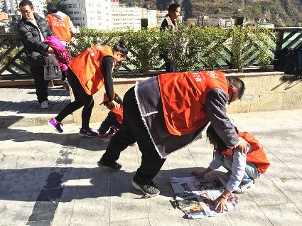 在瀘定橋上,小記者們向游客講述當(dāng)年“紅軍飛奪瀘定橋”的英雄壯舉。在瀘定橋河西長廊,帶隊老師組織小記者和家長們進行了“向目標前進”的親子互動游戲,游戲?qū)议L和孩子的默契程度進行了考驗,鍛煉了他們的智力和體力。在瀘定紅軍紀念館廣場上,小記者們按照帶隊老師的要求進行拼接游戲,完成“小小紅軍支援前線”,獲勝的小組獲得了獎品。游戲結(jié)束后,小記者們在講解人員的帶領(lǐng)下參觀了瀘定紅軍紀念館,了解了許多相關(guān)的歷史知識。同時,小記者們以組為單位開展了“講紅色故事”活動,講解內(nèi)容涉及瀘定橋的修建、瀘定橋勇士英勇犧牲的故事等,讓小記者進一步了解到了瀘定縣的紅色歷史文化。