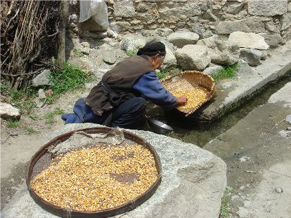 那天清晨,我們一行就乘坐曉雨哥所開轎車從康定城出發(fā)了。從顯得很懸的山路上到位于山頂平壩的嵐安古鎮(zhèn)時,才8點過一點。朝鎮(zhèn)里走去,先后見到了從地里背洋芋回家的小孩、從地里收了豆菽枯藤的中年人等。