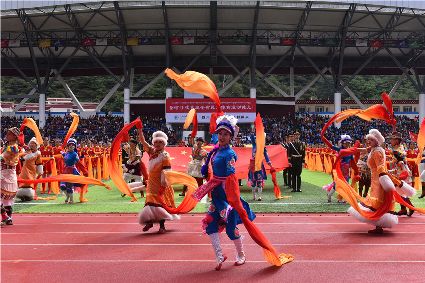 “本屆少數(shù)民族傳統(tǒng)體育運動會的會徽以格薩爾王賽馬登位為基本形象,由字母‘SC’組成的騎手代表‘四川’,數(shù)字‘15’組成了昂揚奔騰的‘馬’為主體的形象,代表‘15屆民運會’。這既有藏民族特色,又顯得美觀大方?!痹陂_幕式現(xiàn)場,來自杭州的陳琳興致勃勃地說。