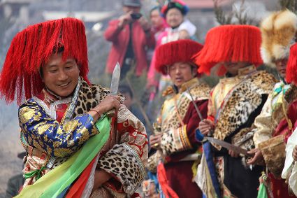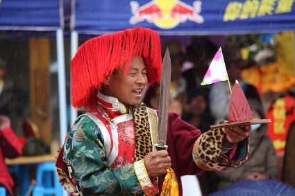 除了歌舞文化,德欽還是民俗文化最大的平臺,神山祭祀是村村寨寨必不可少的活動,在德欽,藏民對山水自然賦予了靈性,認(rèn)為自然也是和人一樣有著生命和靈性,尊重自然演繹出神山祭祀活動豐富多彩?!暗顿潯?藏語稱“百諧”。在德欽農(nóng)村,刀贊是祭祀活動的重頭戲,這一天,不亞于一個盛大的服飾表演。相傳“百諧”是古時村民為消除戰(zhàn)亂,祈福平安的一項傳統(tǒng)祭祀活動,延續(xù)至今已經(jīng)成為一項傳統(tǒng)的民俗活動?!鞍僦C”既是祭祀活動的一個儀式,也是一個獨立的傳統(tǒng)民俗活動,村里每戶一男丁在這一天必須參加“百諧”。“蘇夏”是村里男人戴的最為隆重的帽子,他不同于金邊帽和狐皮帽。長刀是“刀贊”的道具, “吉祥的日子里,我們一敬天地,賜給我們帶來幸福的生活;再敬尊敬的共產(chǎn)黨,為我們帶來平安吉祥;三敬慈祥的雙親,教會我們?nèi)绾巫鲆粋€好人……”朗朗上口的說詞伴著閃閃的刀光起舞,頗具康巴壯士的英武陽剛。