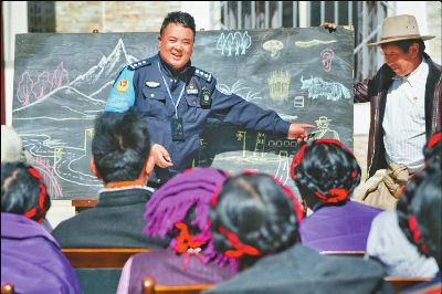 陽春三月,康定市甲根壩鄉(xiāng)扎日村壩子里,村民們圍在黑板前,認(rèn)真聽著民警巴桑呷瓦妙趣橫生、詼諧幽默的“授課”,時(shí)不時(shí)發(fā)出開心的笑聲。
