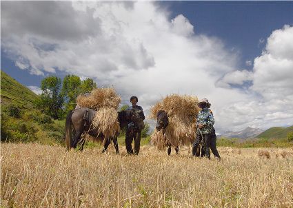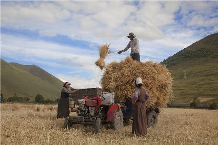 聯(lián)合收割機已在高原大地施展威力。那些平坦的大地里,拖拉機的穿梭,收割機的鳴唱,耳聞目睹,隨外可見。在山地間,大型機械無法進入的地方,原始的勞作仍沒失去它本身的價值。“汗滴禾下土,粒粒皆辛苦”的場面仍然存在……農(nóng)人的歡歌喜語浸漫于天地間,豐收的喜悅早把辛勤的勞作沖淡。