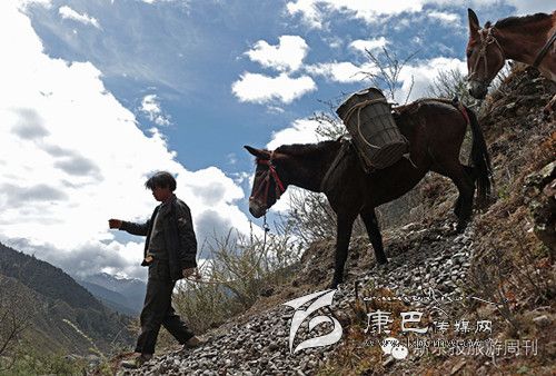 這是318和317國道都不通過的甘孜州白玉縣,從白玉縣城通往建設(shè)鄉(xiāng)德沙村的路是一條木制棧橋,2014年5月4日的中午,兩頭騾子在300斤石料的重壓下踩斷了中間的橋板,兩條前腿從踩碎的木板處懸著,騾子發(fā)出粗壯的喘息聲,無法掙扎,不能動彈。棧橋上有路過的藏民,手中旋轉(zhuǎn)著轉(zhuǎn)經(jīng)筒,他口中念念有詞:騾子啊,你還沒有得到解脫。一群來自外地的游客都很驚詫。 騾子運(yùn)輸隊的王玉海,在過往行人和同行的騾隊鄉(xiāng)親的幫助下,先卸下騾子身上背負(fù)的碎石,然后手伸到騾子前腿根處,用力抬起騾子的前身。在查看騾子沒有受傷后,王玉海把這兩只騾子牽到騾隊最后面,然后,引著另外5只負(fù)重的騾子,從橋靠左邊的雙層木板橋面上通過,騾子隊受到驚嚇,不愿意上橋,王玉海安撫了一會兒騾子隊后,在同伴的協(xié)作下,前面牽引,后面驅(qū)趕,終于,王玉海的7只騾子過橋,其他8個同伴的50多頭負(fù)重的騾子也一一通過。