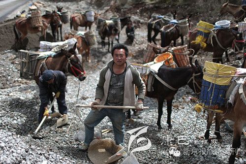 每天早上6點(diǎn)多,王玉海和同伴趕著騾子隊,從白玉縣縣城旁邊的住地步行約1小時到達(dá)德沙村,約8開始從離索道橋約300米的路邊沙石場裝運(yùn)碎石。他們通常工作到下午5點(diǎn),每只騾子在海拔3000米左右的高度,來回運(yùn)送20次左右,每只騾子運(yùn)輸碎石大約在3000公斤左右。這些騾子正當(dāng)強(qiáng)壯年,年齡大約在三四歲,通常在坡度在30度以下的,最大負(fù)重約800斤。