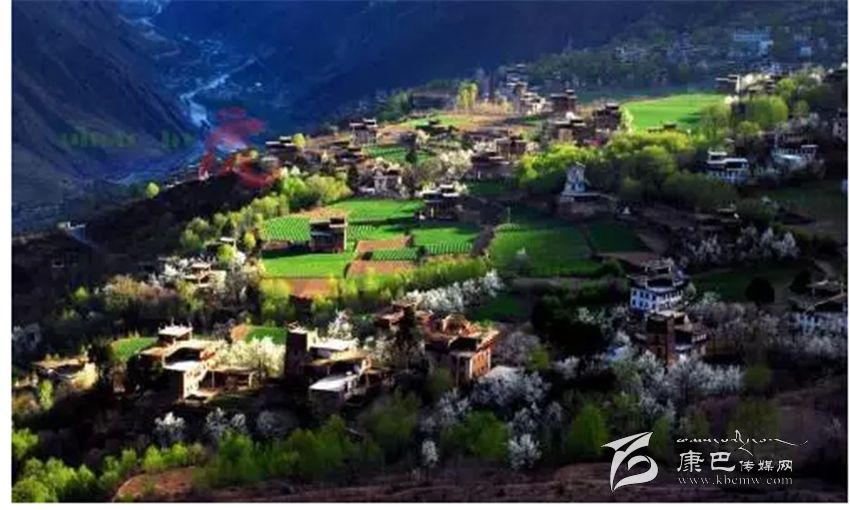 位于四川省甘孜州丹巴縣東北部,白色的藏房、金頂?shù)乃聫R還有歷史悠久的古碉樓在透藍(lán)的天空下隱約可見,猶如置身于桃花源之中。