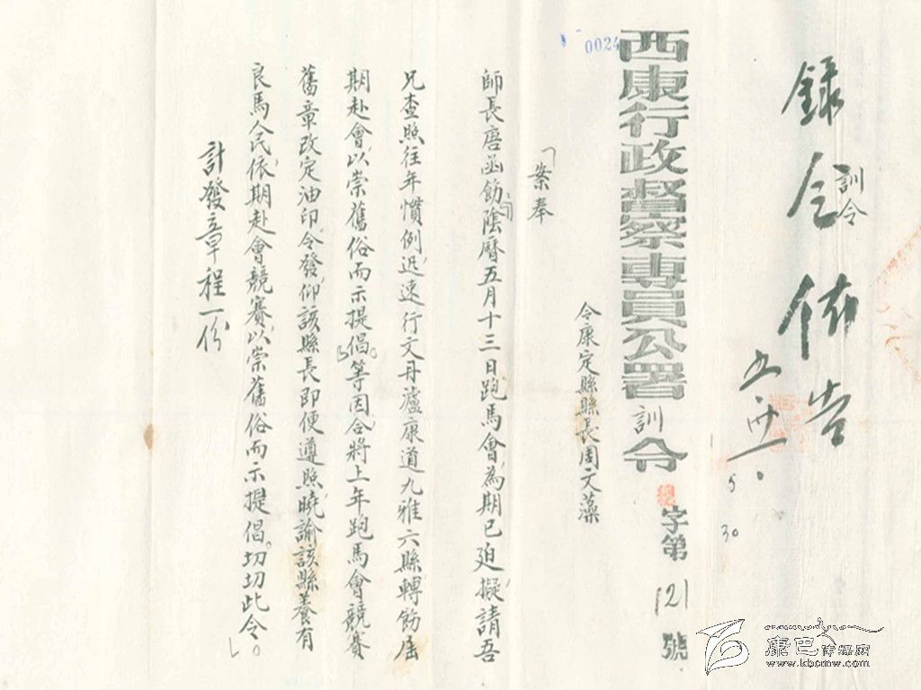 康定城各民族雜居,各種民族文化相融,形成了康定特有的民俗、風俗?,F(xiàn)在已經(jīng)不可能見到的“郭達將軍廟會”和每年“四月八轉(zhuǎn)山會”期間在康定城郊舉辦的“賽馬會”,這些屬于康定特有的民俗風情,在民國時期曾經(jīng)盛況空前。舉辦“郭達將軍廟會”,警察要出來維持秩序。這份賽馬簡章特指1940年“四月八轉(zhuǎn)山會”時的一次賽馬。據(jù)《甘孜州志》記載:在1940年的5月,由于有“康定、瀘定、九龍、丹巴、道孚、乾寧”騎手參加賽馬活動,才制定了這份“新簡章”。