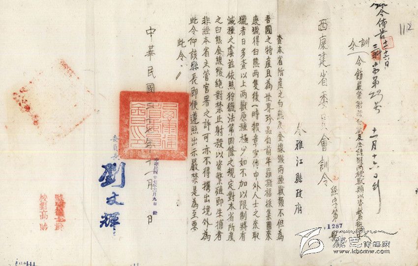 民國27年(公元1938年),“西康省建省委員會”發(fā)出“經字第1287號”訓令,這是一份難能可貴的保護野生動物的訓令,訓令說:“查本省所產之白熊及金線猴兩種獸類,不但為吾國之特產,且為世界珍品。自前年羅斯福采集團來康獵得白熊兩只后,一時報章宣傳,中外人士之來取獵者日多。查以上兩獸原種極少,如不加以限制,將有滅種之虞。茲依照狩獵法第四條之規(guī)定,對本省所產之白熊、金線猴絕對禁止射殺,以資繁殖。即生捕者非經本省主管官署之許可,不得帶出境外。為此令仰該縣長即便遵照出示嚴禁是為至要,此令。”訓令最后署有“西康建省委員會委員長劉文輝”的簽名。