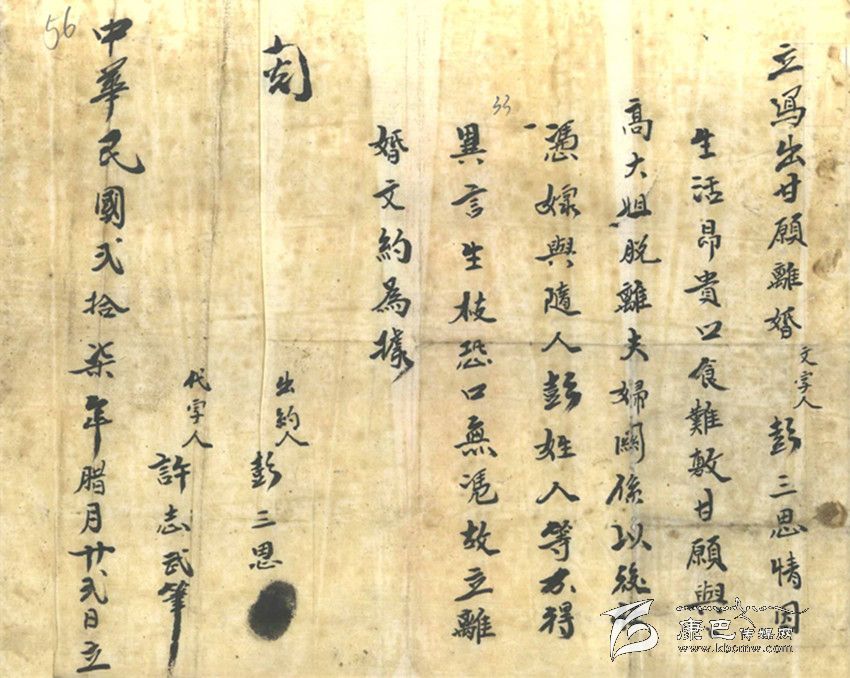 在這張“離婚文約”上看不出女方的任何態(tài)度和意愿,她仿佛只是一個(gè)影子,沒(méi)有了光源,影子也就不會(huì)存在。這位姓彭的男子雖是窮極潦倒之輩,身處社會(huì)底層,卻還是擁有對(duì)更為弱勢(shì)的曾經(jīng)是自己的妻子“要還是不要”或者是“放與不放”的特權(quán)。