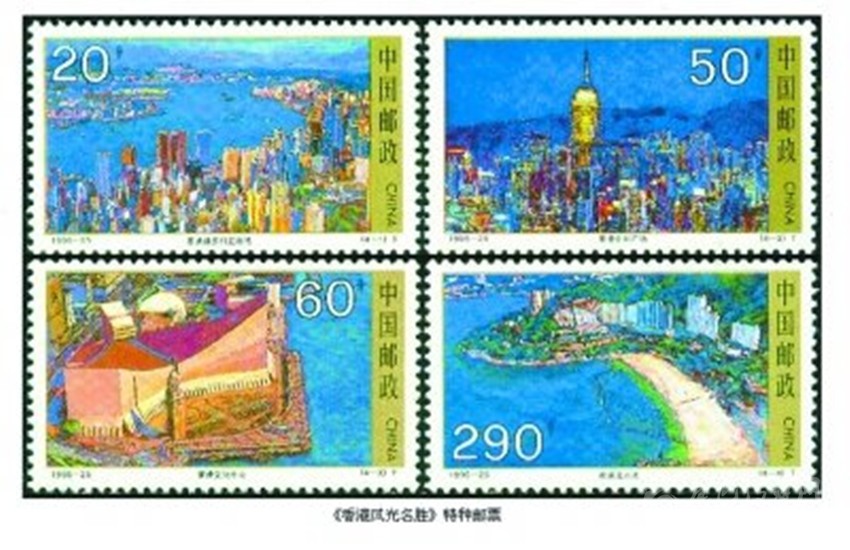 在香港回歸祖國的進(jìn)程中,為了讓全國和世界人民認(rèn)識香港,了解香港,我國相繼發(fā)行了兩套介紹香港風(fēng)光名勝和經(jīng)濟(jì)建設(shè)的特種郵票。1995年11月28日,我國發(fā)行《香港風(fēng)光名勝》特種郵票,全套4枚。圖案分別為“維多利亞港灣”“中環(huán)廣場”“文化中心”和“淺水灣”;1996年12月19日發(fā)行《香港經(jīng)濟(jì)建設(shè)》特種郵票,全套4枚。圖案分別為“香港中銀大廈”“香港集裝箱碼頭”“香港啟德機(jī)場”和“香港聯(lián)合交易所”。