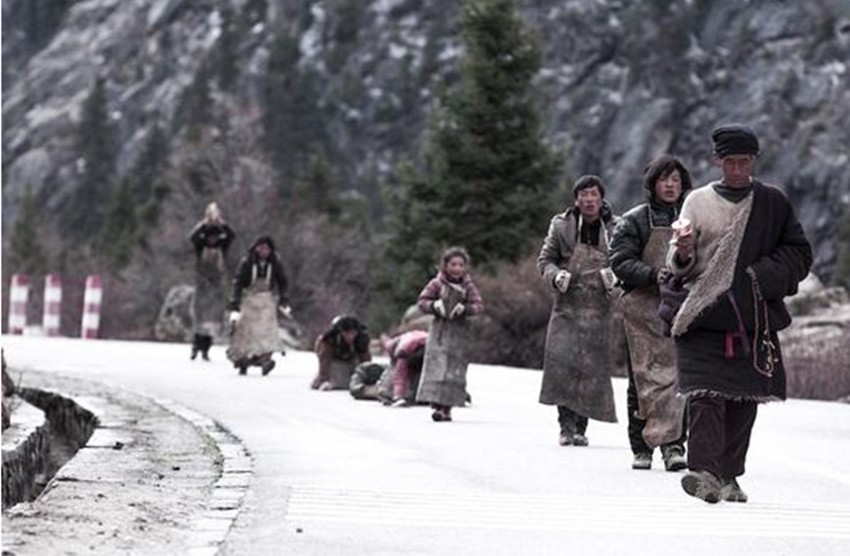 安靜的,用心走入影片,與親人一樣可敬可愛的藏人們圍爐席地而座,一碗接著一碗享用酥油茶和糌粑,細(xì)碎地說些家常的話。探索他們的內(nèi)心世界,選擇與他們一起虔誠朝圣。信仰,使他們變得更加善良、自律,并有著比一般人更強(qiáng)大的信念和毅力。年邁的爺爺為了自己年輕時的夢想踏上朝圣之路;小女孩對前路充滿好奇而無所畏懼;孕婦期許美好未來,更加執(zhí)著;屠夫放下屠刀,義無反顧的朝著圣地邁進(jìn)。在那處漫水的路面,我畏懼了,他們卻毫不猶豫地脫掉外套撲向水里,動作敏捷,無所顧忌,一秉虔誠的心讓人震撼。影片結(jié)束,我?guī)锥嚷錅I……