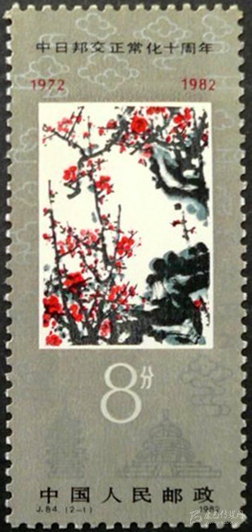 1982年12月發(fā)行的《 中日邦交正常化十周年》紀(jì)念郵票(2-1)“梅花”。