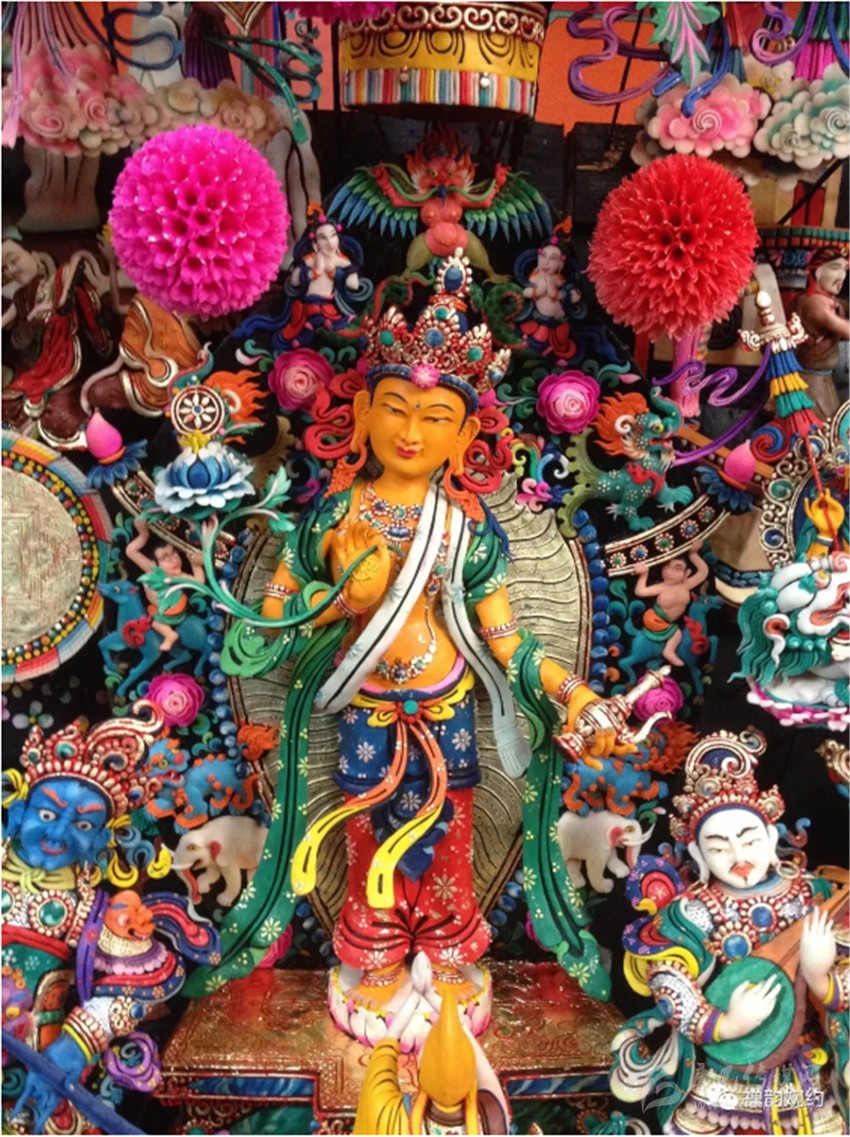 有傳說(shuō)稱641年文成公主進(jìn)藏,帶去一尊釋迦牟尼12歲等身像并將其供奉于拉薩的大昭寺,當(dāng)?shù)厝罕娪盟钟妥龀苫ü┇I(xiàn)于佛前,以示崇敬之心,后各藏傳佛教寺院相繼使用,視為禮佛珍品,獻(xiàn)酥油花遂成為正月祈愿大法會(huì)的重要內(nèi)容。在發(fā)展過(guò)程中,酥油花的塑造方式、花色品種、內(nèi)容題材和工藝技巧都不斷發(fā)生著變化。