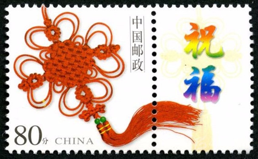 2002年5月10日,中國(guó)郵政發(fā)行《如意》個(gè)性化服務(wù)專用郵票一枚。主票圖案為如意柄端系著一個(gè)紅色“中國(guó)結(jié)”,附票有“祝福”二字; 2003年3月3日,中國(guó)郵政發(fā)行《同心結(jié)》個(gè)性化服務(wù)專用郵票一枚。主票圖案為盤長(zhǎng)結(jié)4邊編織有心型繩結(jié)的同心結(jié),附票為“祝?!倍郑?006年9月25日,中國(guó)郵政發(fā)行《中華全國(guó)歸國(guó)華僑聯(lián)合會(huì)成立五十周年》紀(jì)念郵票一枚。圖案為阿拉伯?dāng)?shù)字“5”與中華全國(guó)歸國(guó)華僑聯(lián)合會(huì)圓形會(huì)徽組成數(shù)字“50”,象征全國(guó)僑聯(lián)五十周年,背景畫面為淡淡的粉紅色“中國(guó)結(jié)”。寓意歸國(guó)華僑與全國(guó)人民血肉相連,同心同德共同建設(shè)美好家園;2013年8月8日,中國(guó)郵政發(fā)行一枚《美好祝?!焚R卡專用郵票,圖案為象征喜慶的紅色“中國(guó)結(jié)”;2014年9月20日,中國(guó)郵政發(fā)行《中國(guó)夢(mèng)(二)——民族振興》特種郵票,其中第四枚“民族團(tuán)結(jié)”,圖案中載歌載舞的各民族群眾上方有一個(gè)大紅的“中國(guó)結(jié)”,象征著各民族大團(tuán)結(jié)。