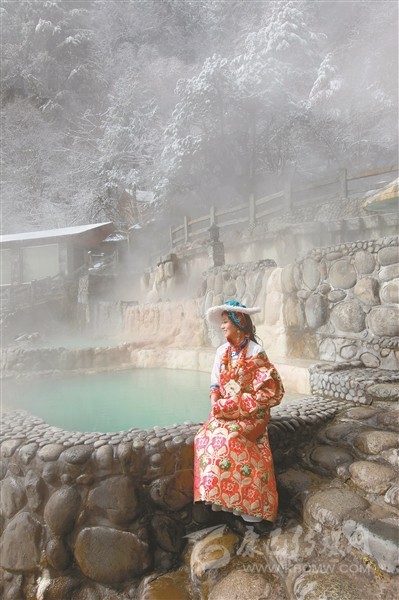 圖為游客在海螺溝冰川溫泉度假村拍攝藝術(shù)照。