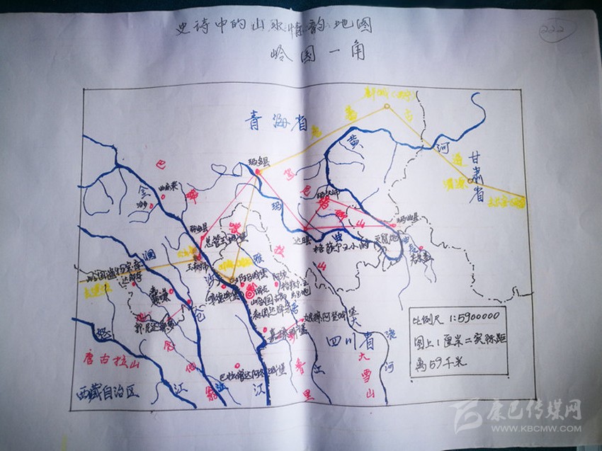 幾十個(gè)春秋里,劉安全所做的遠(yuǎn)不止這些。他還自制了平面地圖、格薩爾王族譜圖等。根據(jù)實(shí)地考察所見(jiàn),他繪制了43個(gè)“嶺”國(guó)城堡遺址地形簡(jiǎn)圖,記者見(jiàn)到了其中幾幅。圖中,大山、河湖、遺址等清晰可見(jiàn),不失為了解格薩爾史詩(shī)的上好資料。