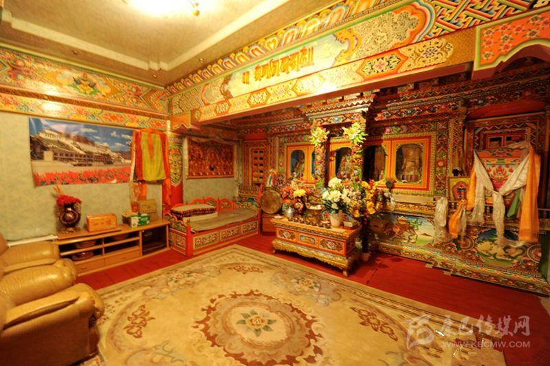 藏族居室一般分臥室、客廳、經(jīng)堂和廚房等部分。室內陳設與裝飾如藏式建筑學者葉啟燊所言:“主次分明,重點突出。主室較為復雜而樸素,經(jīng)堂偏于華麗而清幽,其余各室均較簡單。室內都不施粉刷,但有個別的經(jīng)堂作雕刻裝飾;土司和喇嘛上層的經(jīng)堂則會作油漆的彩畫。”藏區(qū)不論是農(nóng)牧民住宅還是貴族上層府邸都有供佛的設施,經(jīng)堂屬于凈地,是專門供奉神佛的,因此,一般不作他用;主室是藏族住宅中最重要的一個房間,也是功能最多的房間,其中有生活、睡眠、飲食等所需的爐灶、壁櫥、壁架、矮桌、火盆等。這些藏式家具的布置安放,早已形成一定之規(guī)。
