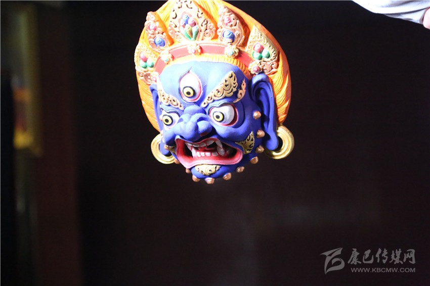 待面具自然風(fēng)干后,用礦物質(zhì)、植物的根等制作的自然顏料進行著色,自然顏料有不變色、耐光的特性,通過一淡、二濃、三淡的上色過程使面具涂色均勻,待顏料曬干后對面具進行磨光,去除雜物,再對面具進行裝藏念經(jīng),如此,一個藥泥面具制作完成。做好的藥泥面具有濃郁的藥材香氣,并有著驅(qū)蚊、殺菌、抗病毒、清潔空氣、解除疲勞等功效。