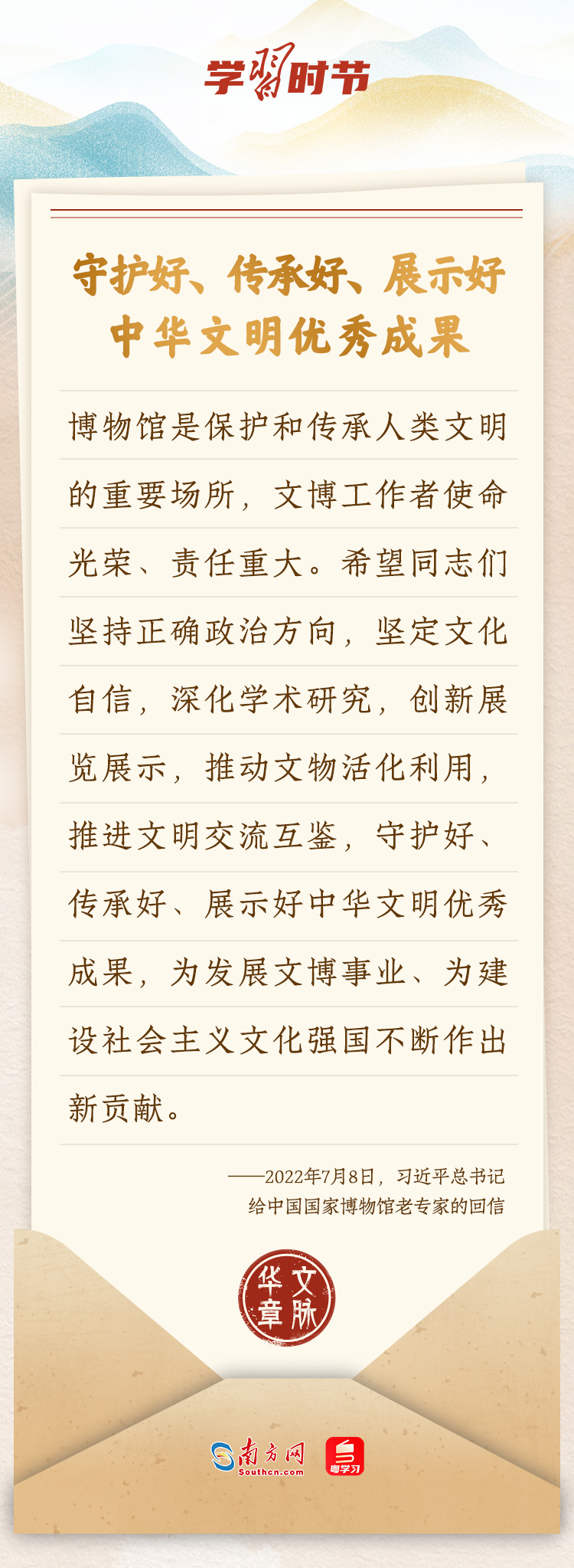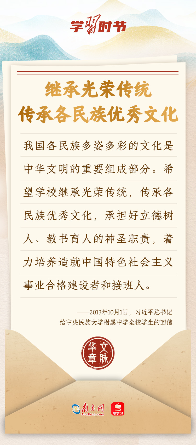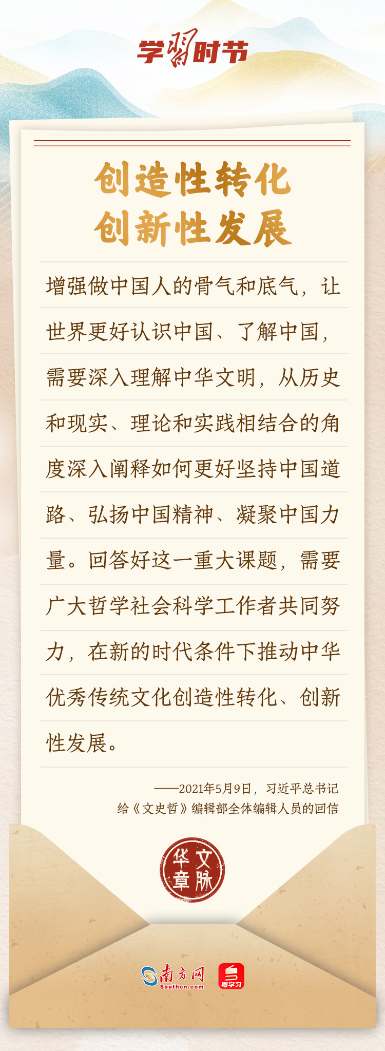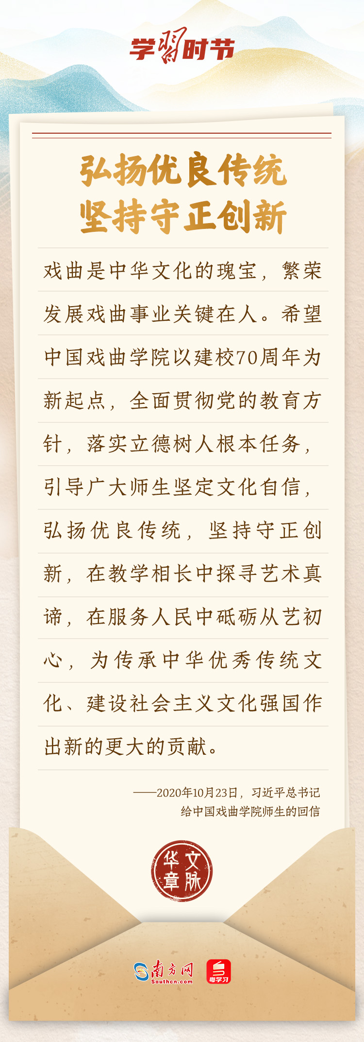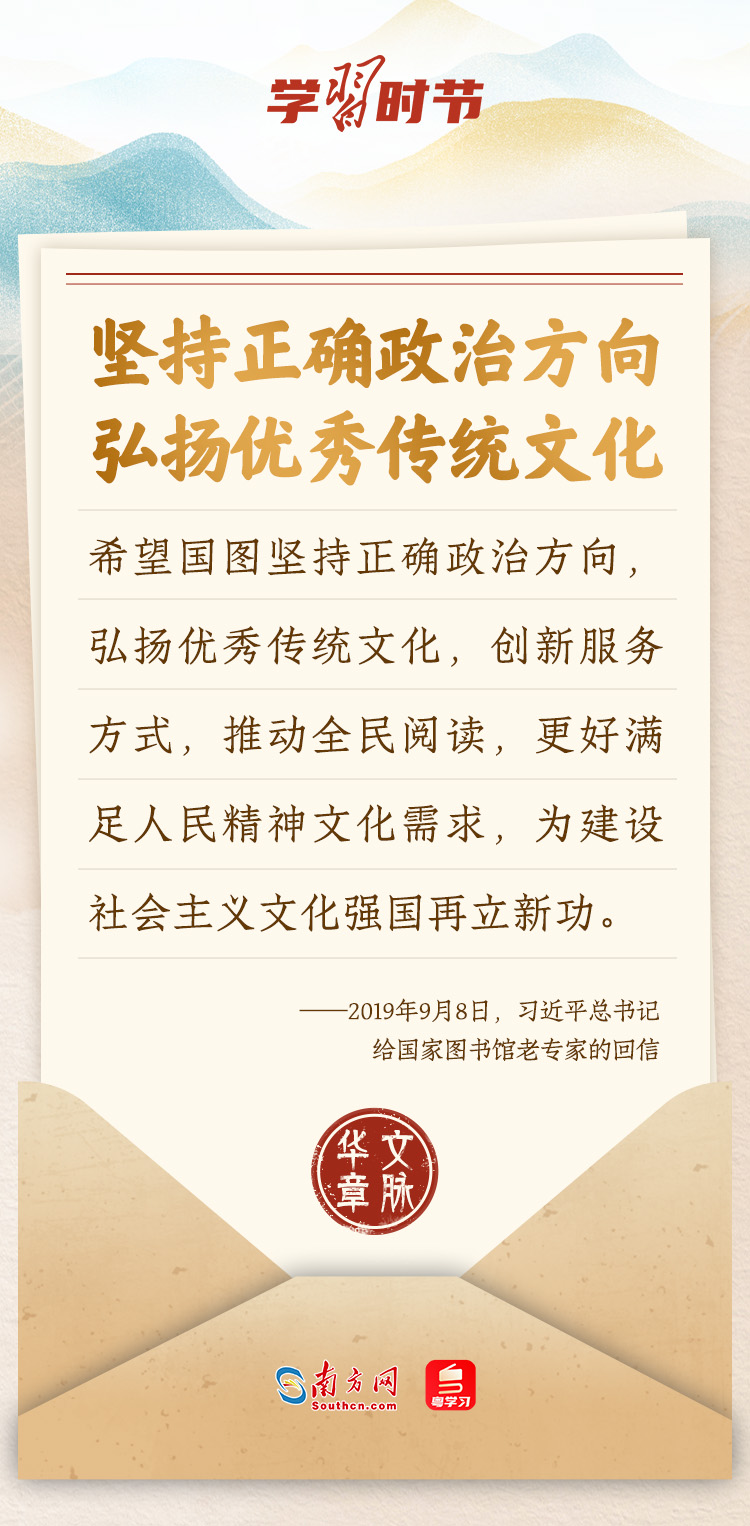 “中華民族在幾千年歷史中創(chuàng)造和延續(xù)的中華優(yōu)秀傳統(tǒng)文化,是中華民族的根和魂?!绷暯娇倳浂啻瓮ㄟ^發(fā)賀信、寫回信等方式,表達著對弘揚中華優(yōu)秀傳統(tǒng)文化的殷切希望,飽含深情、字字暖心、催人奮進。讓我們一起“讀”信。