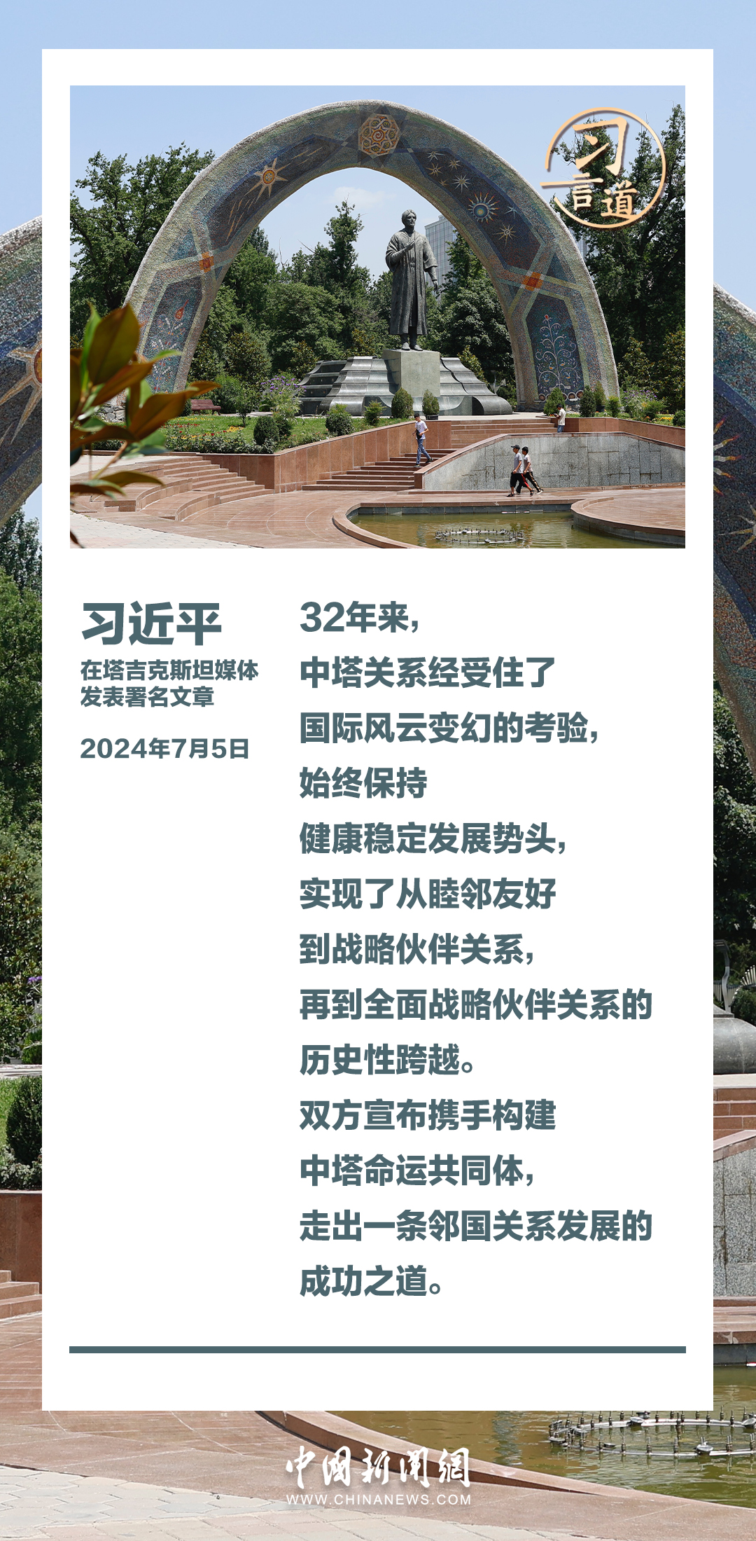 7月5日,在對塔吉克斯坦進行國事訪問之際,國家主席習近平在塔吉克斯坦《人民報》和“霍瓦爾”國家通訊社發(fā)表題為《共創(chuàng)中塔關(guān)系美好明天》的署名文章。習近平指出——