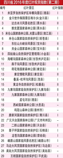 整個紅葉觀賞季期間,由省林業(yè)廳、省旅游局指導(dǎo),省生態(tài)旅游協(xié)會監(jiān)測的紅葉觀賞指數(shù)將持續(xù)發(fā)布。每周四,華西都市報將每周發(fā)布一期“紅葉指數(shù)”。在10月19日四川省林業(yè)廳發(fā)布的第二期紅葉觀賞指數(shù)中可以看到,理縣孟屯河谷、達(dá)古冰川、四姑娘山、九寨黃龍等9個點(diǎn)位都達(dá)到Ⅱ級紅葉觀賞指數(shù)。較之上周,更多點(diǎn)位的葉子開始進(jìn)入適宜觀賞期。紅葉巔峰期近在眼前。