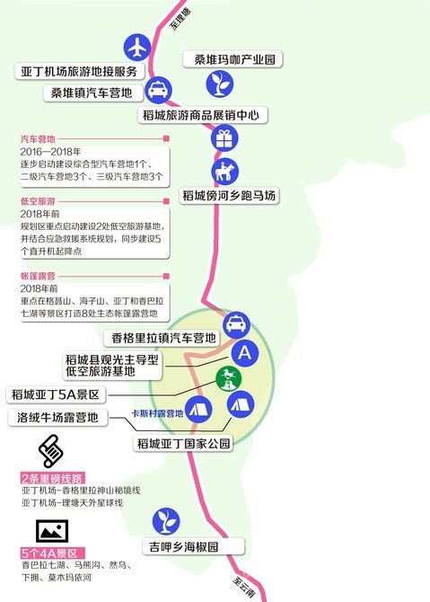 根據(jù)《規(guī)劃》,將結(jié)合道路交通和旅游景區(qū)景點(diǎn)分布,2016—2018年,逐步啟動(dòng)建設(shè)綜合型汽車(chē)營(yíng)地1個(gè)、二級(jí)汽車(chē)營(yíng)地3個(gè)、三級(jí)汽車(chē)營(yíng)地3個(gè),作為建設(shè)環(huán)亞丁兩小時(shí)旅游圈的重要旅游項(xiàng)目,滿足日益增長(zhǎng)的自駕車(chē)游客需求。