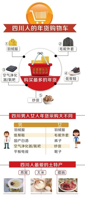 還有幾天就過年了,你們家買了哪些年貨?近日,電商平臺阿里巴巴和京東先后推出了年貨大數(shù)據(jù)。從這些數(shù)據(jù)中,我們能看到一個典型成都人的年貨網(wǎng)絡(luò)購物車是這樣的:購買最多的年貨還是衣服,其中羽絨服、毛呢外套是成都人的最愛;家電和電子產(chǎn)品愛買空氣凈化設(shè)備和玫瑰金iPhone7手機;食品是山核桃等炒貨,以及國產(chǎn)白酒。在女性偏好酒水消費的排名中,四川女性排名第五。