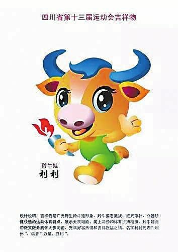 吉祥物是廣元野生羚牛娃形象。羚牛姿態(tài)挺拔,威武雄壯,凸顯矯健快速的運(yùn)動(dòng)體育特點(diǎn),展現(xiàn)無(wú)畏艱險(xiǎn)、向上沖勁和體育拼搏精神。羚牛娃面帶微笑,敞開胸懷大步向前,充滿好客熱情和吉祥祝福之情。名字利利代表“利州”,諧音“力量、勝利”。