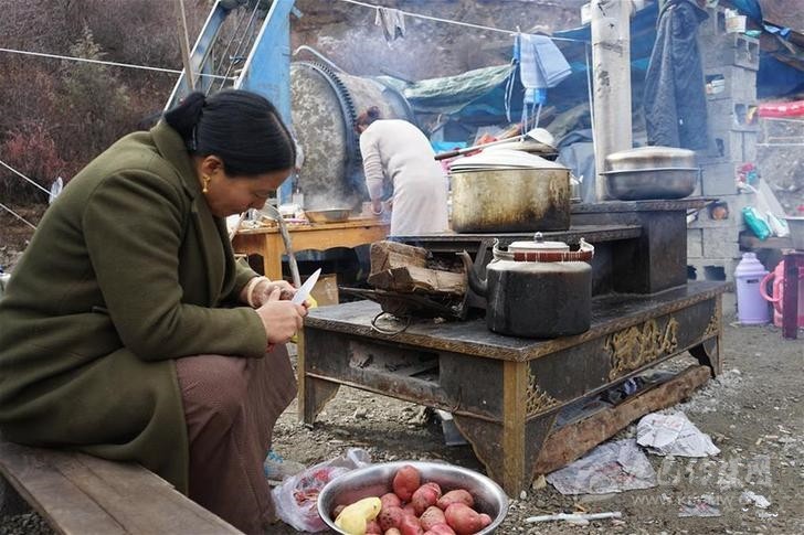 在四川甘孜藏族自治州白玉縣金沙鄉(xiāng)安置點(diǎn),八吉村村民在準(zhǔn)備午飯(11月17日攝)。新華社記者 張海磊 攝