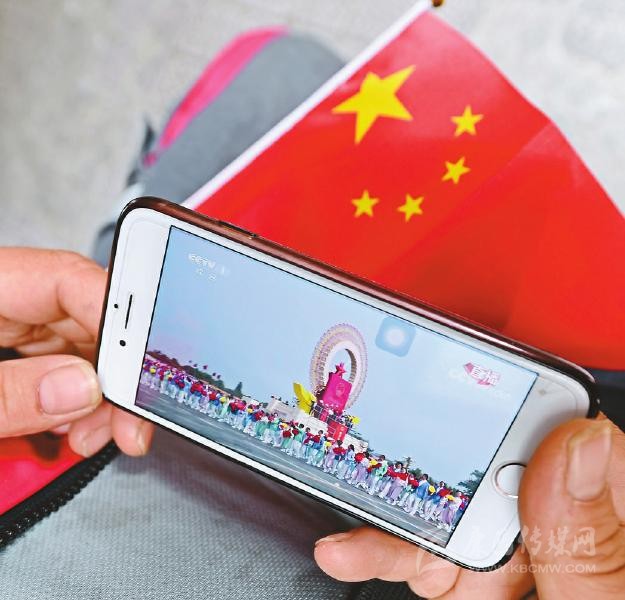 群眾在手機上收看慶祝大會。川報記者何海洋攝