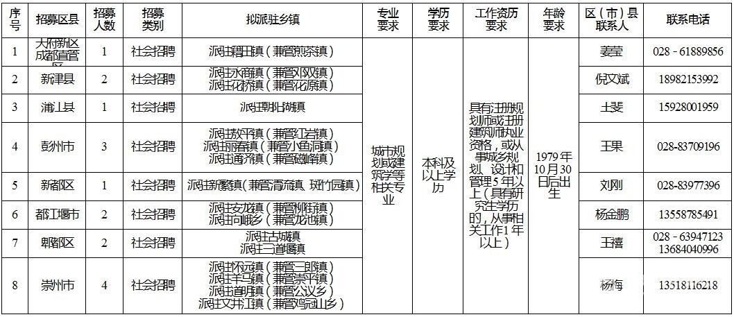 1﹒社會招聘招募區(qū)(市)縣:成都天府新區(qū)、新都區(qū)、郫都區(qū)、簡陽市、都江堰市、彭州市、邛崍市、崇州市、金堂縣、新津縣、大邑縣、蒲江縣(具體信息詳見附件1)。