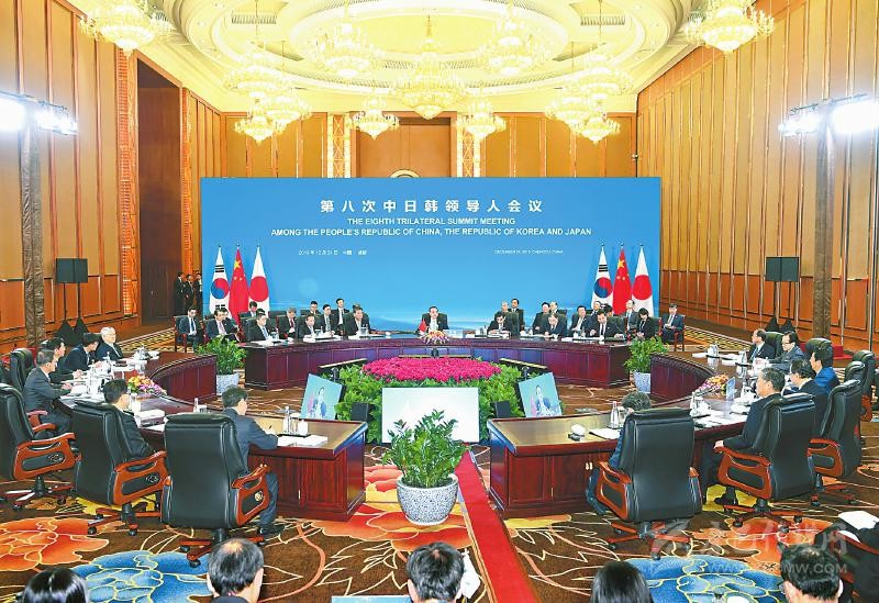 十二月二十四日,國務(wù)院總理李克強(qiáng)在成都與韓國總統(tǒng)文在寅、日本首相安倍晉三共同出席第八次中日韓領(lǐng)導(dǎo)人會議。新華社記者 張領(lǐng) 攝