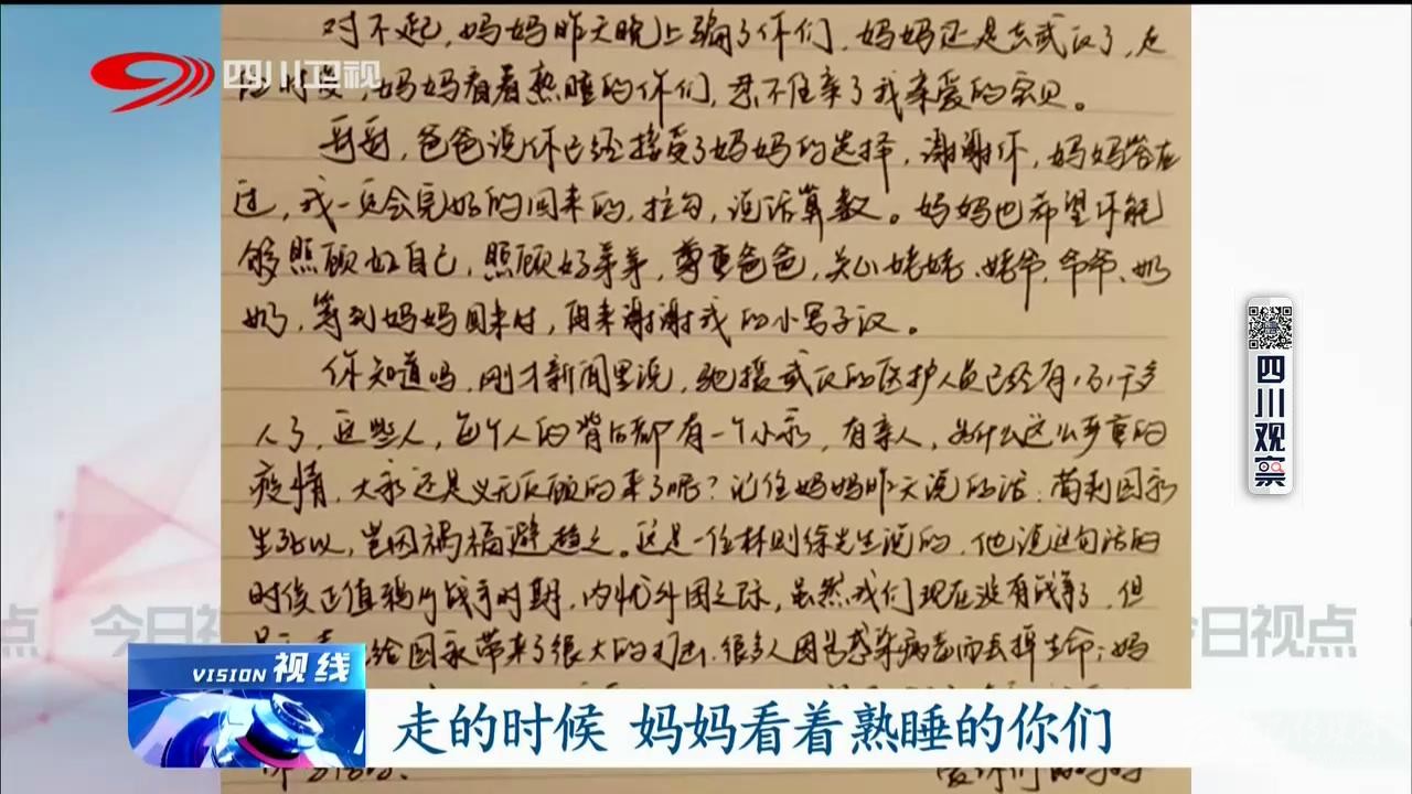 “媽媽還是騙了你,去了武漢,走的時候看到你們還在熟睡,忍不住親了我親愛的寶貝。哥哥,爸爸說你已經(jīng)接受了***選擇,謝謝你,媽媽答應(yīng)過我一定會完好的回來的,拉鉤,說話算話……”