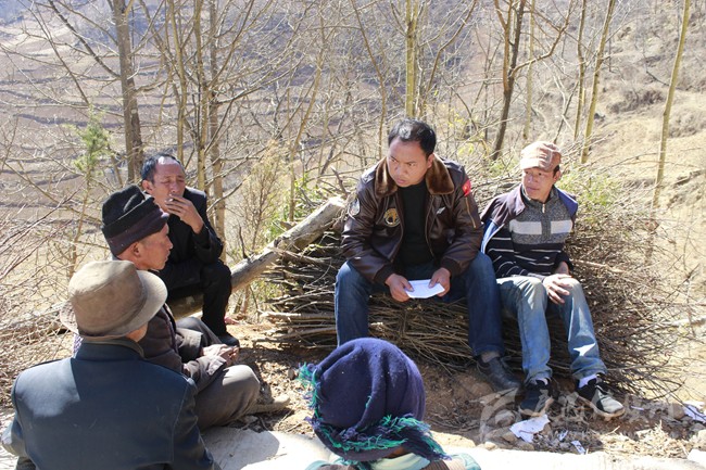 牟爾古(中)入戶核實(shí)收入、登記年輕人的基本信息。受訪者供圖
