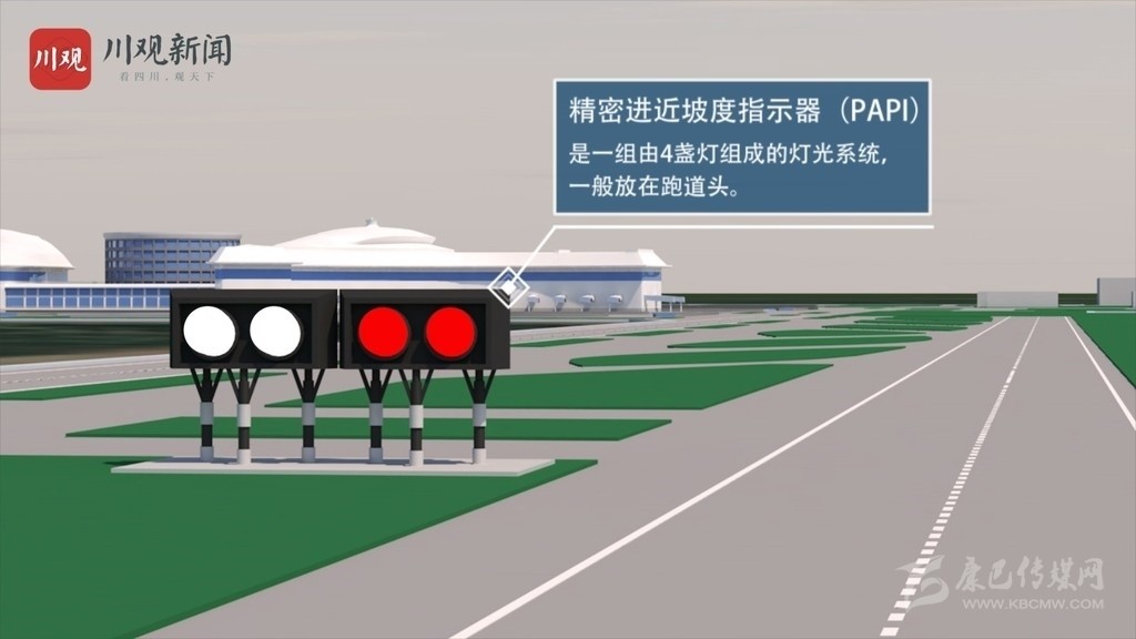 緊密進(jìn)近坡度指示器(PAPI),是一組由4盞燈組成的燈光系統(tǒng),一般放在跑道頭。飛行員從空中觀察,如果高于預(yù)定下滑道,PAPI燈顯示全白,反之則顯示全紅。飛行員如果看到兩紅兩白的PAPI燈,就說明飛機(jī)下滑坡度正確,能夠安全降落。