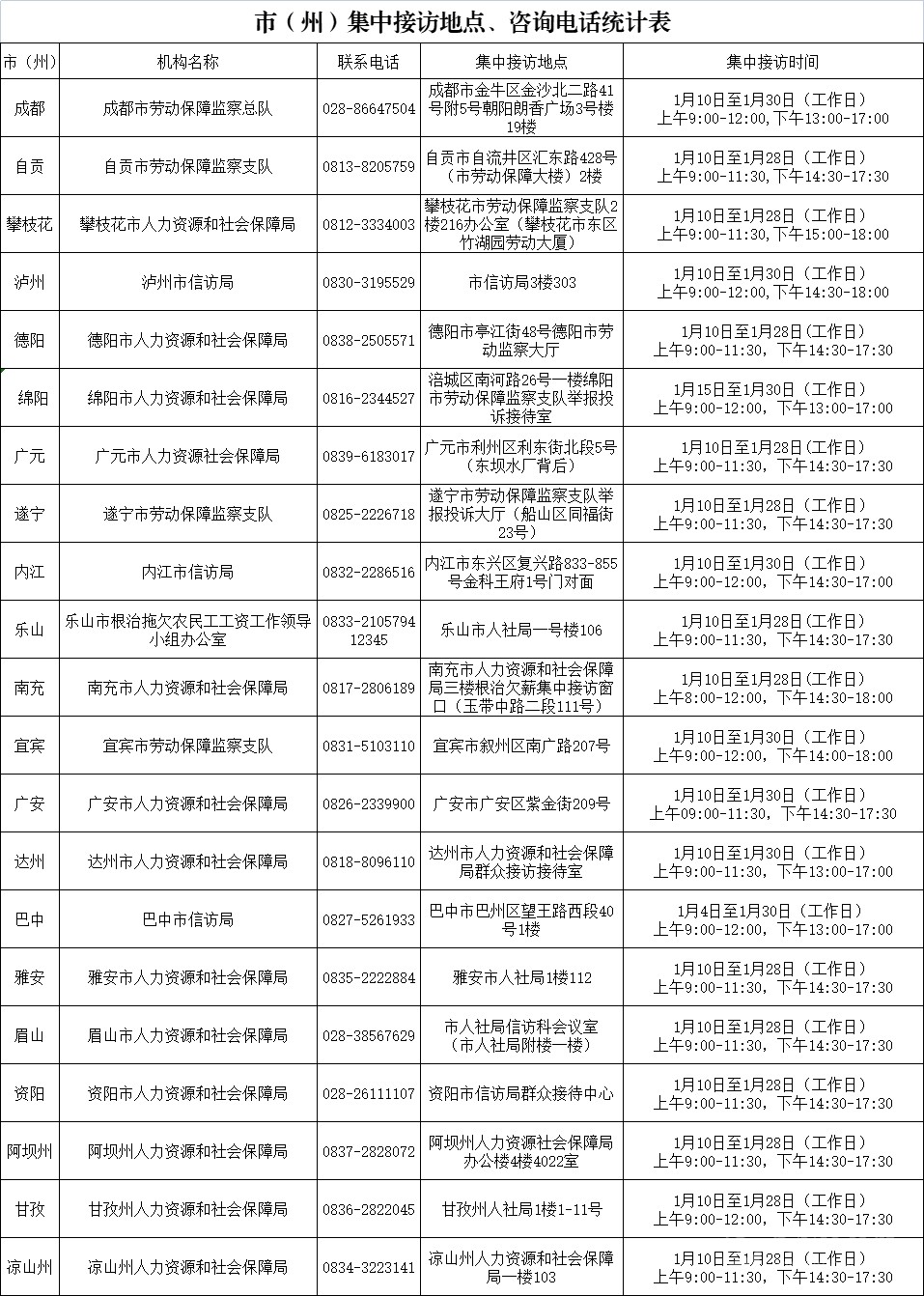 為深入推進“我為群眾辦實事”活動,進一步暢通舉報投訴渠道,壓實各地各有關部門責任,切實做好春節(jié)前保障農(nóng)民工工資支付工作。從1月10日起,四川省開展拖欠農(nóng)民工工資舉報投訴集中接訪活動啟動。省級層面,省根治拖欠農(nóng)民工工資工作領導小組辦公室組織人力資源和社會保障廳、住房和城鄉(xiāng)建設廳等10家成員單位有關負責人集中接訪問,各市(州)也同步開展集中接訪活動。
