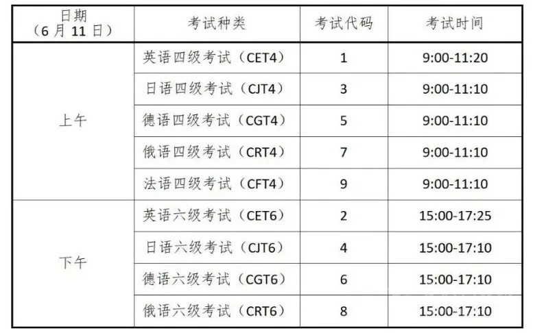 CET考試時(shí)間為6月11日,開(kāi)考科目為英語(yǔ)、日語(yǔ)、德語(yǔ)和俄語(yǔ)4個(gè)語(yǔ)種的四級(jí)和六級(jí),法語(yǔ)四級(jí)。具體場(chǎng)次安排如下: