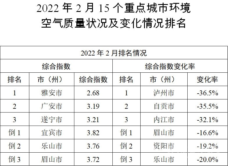 四川省生態(tài)環(huán)境廳副廳長李銀昌介紹,今年2月,全省15個重點城市環(huán)境空氣質(zhì)量均呈改善趨勢,改善同比較好的前3名依次為瀘州市、自貢市、內(nèi)江市,改善同比較好的后3名依次為眉山市、資陽市、樂山市。6個非重點城市空氣質(zhì)量綜合指數(shù)排名依次為甘孜州、阿壩州、涼山州、巴中市、廣元市、攀枝花市。