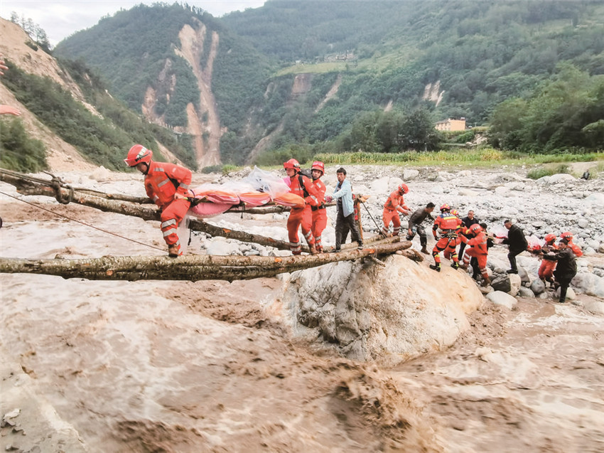 道路中斷、信號(hào)中斷,河流上漲、橋梁垮塌。“沒(méi)有橋,我們的雙手就是橋。”關(guān)鍵時(shí)刻,四川省森林消防總隊(duì)甘孜支隊(duì)消防員兵分兩路實(shí)施營(yíng)救。一路“繩為引、步為尺”先期過(guò)河救治傷員,一路就地取材急流上用樹(shù)干搭起“生命通道”,自制擔(dān)架將傷員一一運(yùn)送過(guò)河;截至5日晚23時(shí)40分,甘孜森林消防隊(duì)員們翻山越嶺往返近7小時(shí),安全轉(zhuǎn)運(yùn)重傷員24人、近200名群眾,徒步行程18公里。