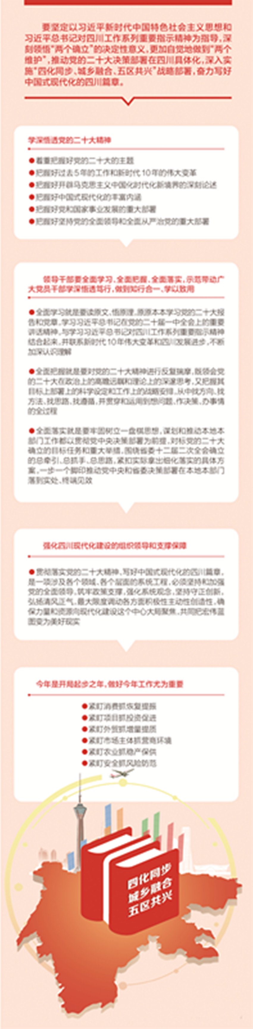 會議指出,今年是貫徹落實黨的二十大精神的開局之年,做好各項工作意義重大、十分重要。新春伊始,省委以“開春第一課”的形式舉辦了學(xué)習(xí)貫徹黨的二十大精神讀書班,深刻闡述了四川現(xiàn)代化建設(shè)的實踐問題,明確了推動“四化同步、城鄉(xiāng)融合、五區(qū)共興”重大戰(zhàn)略部署的實踐要求,對當(dāng)前經(jīng)濟(jì)發(fā)展工作進(jìn)行再強(qiáng)調(diào)再安排,為我們學(xué)習(xí)宣傳貫徹黨的二十大精神、推動甘孜經(jīng)濟(jì)社會高質(zhì)量發(fā)展指明了方向。各級領(lǐng)導(dǎo)干部要切實把思想和行動統(tǒng)一到中央、省委決策部署上來,收住心、定住氣、穩(wěn)住神,敢為敢闖、苦干實干,確保一季度起好步開好局,為全面完成年度經(jīng)濟(jì)社會發(fā)展預(yù)期目標(biāo)任務(wù)打下堅實基礎(chǔ)。