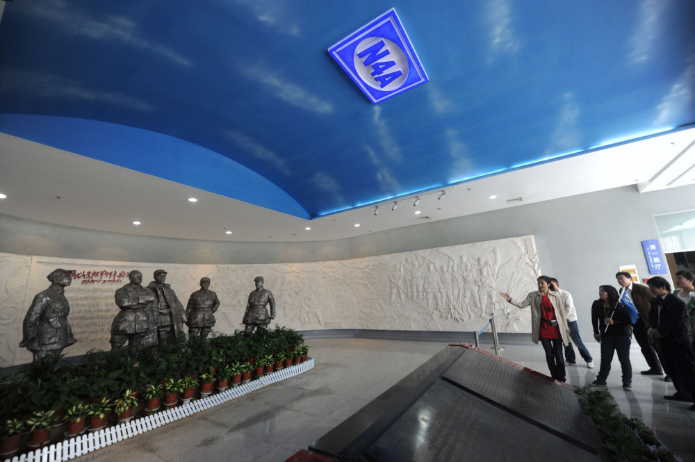 ↑ 在鹽城新四軍紀(jì)念館,講解員在向觀眾介紹展廳入口處的浮雕和塑像(2011年5月27日攝)。