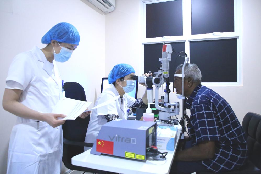 ??2023年2月4日,在馬爾代夫首都馬累附近的胡魯馬累醫(yī)院,中國-馬爾代夫眼科中心中方專家為當地患者做眼科檢查。