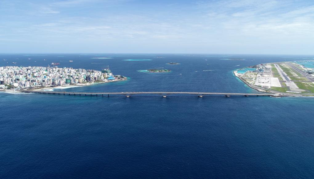 ??這是航拍的連接馬爾代夫首都馬累和機場島的中馬友誼大橋。
