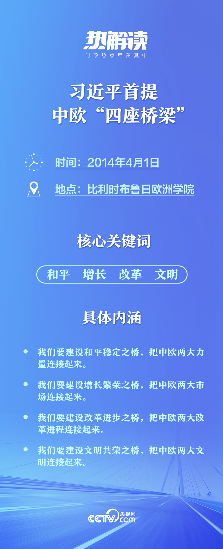 2014年,在位于比利時有著“歐洲政治家的搖籃”之稱的布魯日歐洲學(xué)院,習(xí)主席發(fā)表重要演講。他借用“布魯日”在弗拉芒語中“橋”的含義,全面闡述中國對歐政策,首次提出中歐要建設(shè)“四座橋梁”主張: