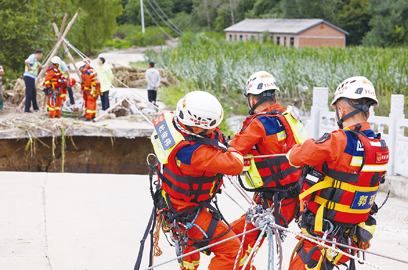 2023年夏,面對影響華北、黃淮、東北等地的嚴重汛情,在以習近平同志為核心的黨中央堅強領(lǐng)導(dǎo)下,廣大黨員干部為守護人民生命和財產(chǎn)安全挺身向前,千千萬萬人民群眾為保衛(wèi)家園頑強奮戰(zhàn)。圖為8月6日,吉林省吉林市消防救援支隊隊員利用繩橋解救受困村民。 新華社記者 顏麟蘊/攝